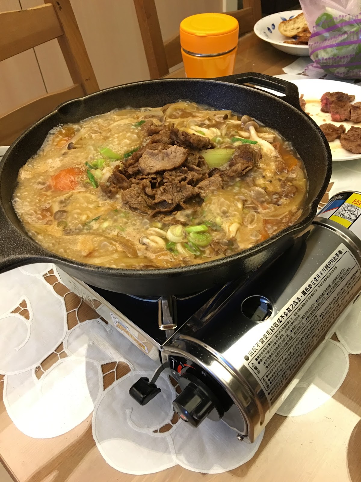 用小瓦斯爐保溫就可以邊煮邊吃了,肉撈起來後看是要丟回去熱一下再吃或是起鍋當燒肉直接吃都可以。